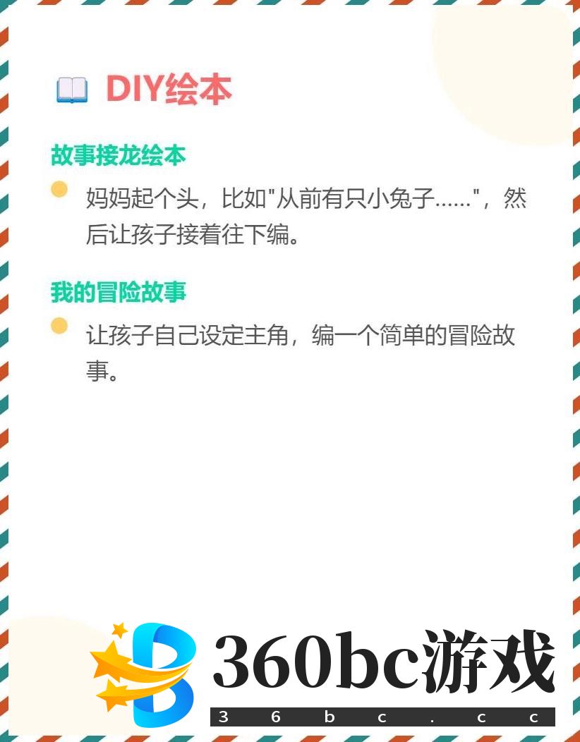 通过故事接龙与孩子共同创作,既激发想象力,又增强亲子互动。 ► 怎么玩 故事接龙绘本:妈妈先提出一个开头,例如“从前有只小兔子……”,接着引导孩子发挥想象,接续故事。 我的冒险故事:让孩子自主构思主角,创作一段简单的冒险故事,体验成为小小故事家的乐趣。
