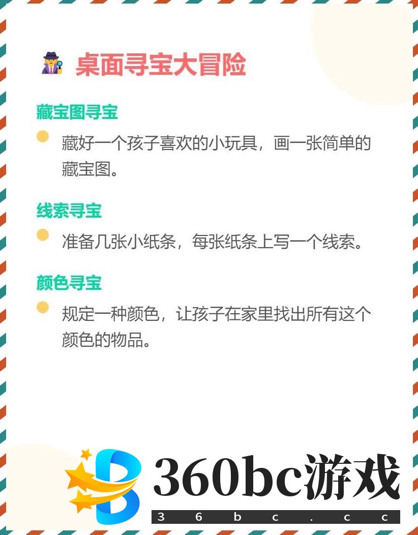通过藏宝图、线索和颜色寻宝等方式,在家中进行一场乐趣无穷的搜索游戏。 ► 玩法介绍 藏宝图寻宝:精心隐藏孩子喜爱的小玩具或零食,并绘制一张简洁的藏宝图,以图形和箭头指示藏匿地点,让孩子依据地图探索。 线索寻宝:准备数张小纸条,每张纸条上书写一个线索,如“寻找家中的隐蔽角落”,孩子需依次解开线索,逐步逼近“宝藏”的所在。 颜色寻宝:设定一种特定颜色,让孩子在家中尽情寻找所有相同颜色的物品,锻炼观察力与专注力。