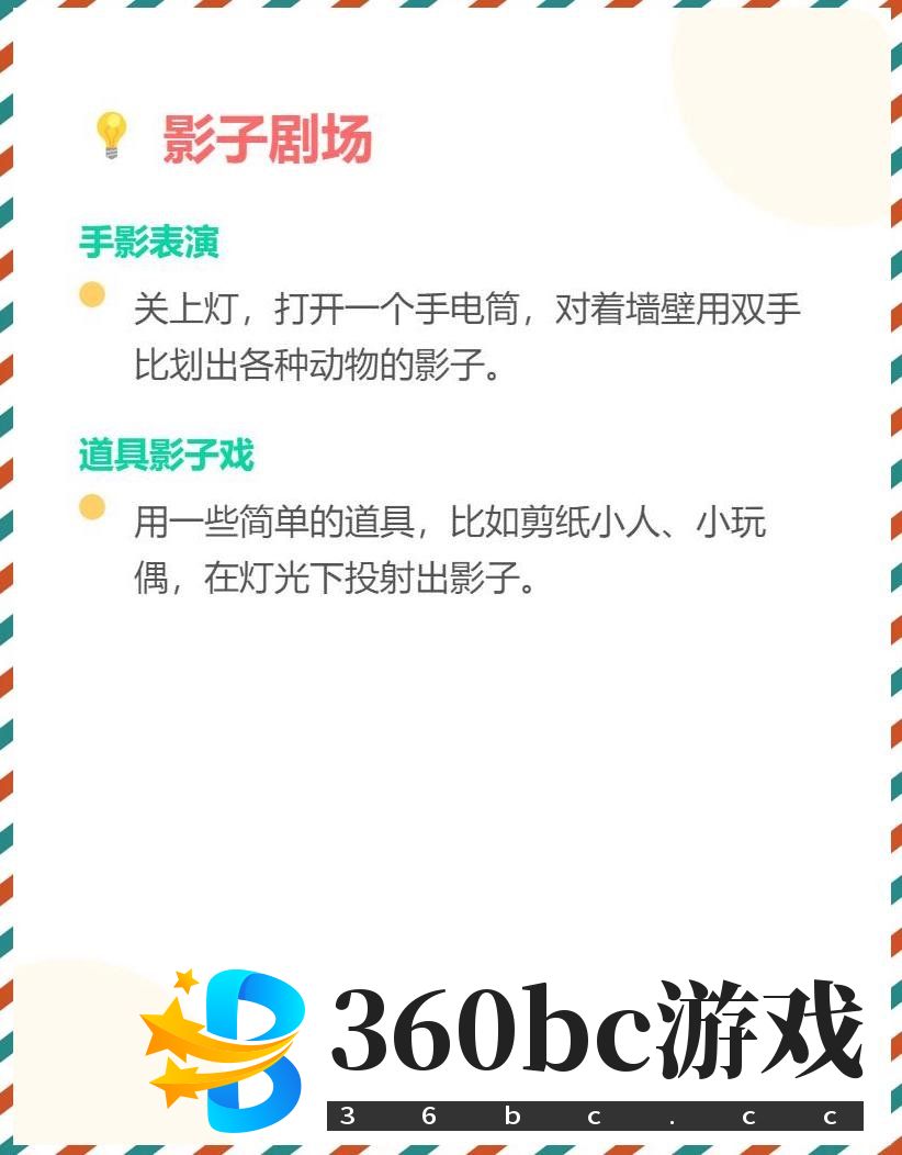 通过手影和道具影子戏,探索光影的魔幻世界,激发孩子的观察力和想象力。 ► 玩法指南 手影表演:在昏暗的环境中,打开手电筒,双手在墙壁上灵活比划,创造出小狗、小兔、飞鸟等各式动物的影子,感受光影的奇妙变幻。 道具影子戏:利用简单的剪纸小人或小玩偶,在灯光下巧妙投射出影子,再与家人共同编织一个充满想象力的故事,体验影子剧的乐趣。
