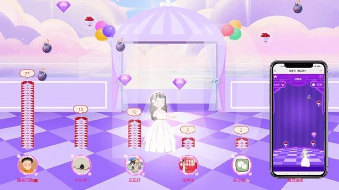 3D签到墙 这是所有现场互动游戏里面最高大上的一个,现场入场的嘉宾可以先进行一个签到,扫个二维码就能完成签到,签到之后大屏幕上会实时动态的展示嘉宾微信头像。并且大屏幕可以根据所有嘉宾头像实时动态的组成各种图案,比如可以组成卡通新人头像、新婚快乐祝福语等。具体图案可以根据自己的需要设置,在婚礼现场绝对是非常具有震撼力的。