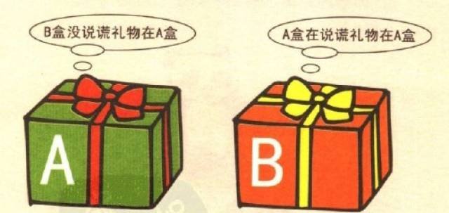 下面来个小小测测试: 据说大学本科生都不知道。 小明快过生日了,妈妈给她准备了一个生日礼物——一条漂亮的裙子。为了考验一下小新,妈妈将礼物放在下面的两个盒子当中的一个,两个盒子上面分别系有一张纸条。 A盒纸条上写着:B盒没说谎礼物在A盒。 B盒纸条上写着:A盒在说谎礼物在A盒。 小新一看,就知道礼物在哪个盒子里,你知道吗?
