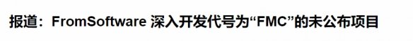 据外媒 mp1st 报道,FromSoftware 正在推进一款尚未公布的新作,开发代号为“FMC”(可能是更长代号的缩写)。目前该项目开发进度已非常成熟,如无延期,预计最快将在明年正式发布。