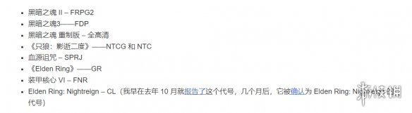外媒汇总FS社历年来部分知名作品的内部代号: 《黑暗之魂2》– FRPG2 《黑暗之魂3》– FDP 《黑暗之魂:重制版》– FHD 《只狼》– NTCG / NTC 《血源诅咒》– SPRJ 《艾尔登法环》– GR 《装甲核心6》– FNR 《艾尔登法环:黑夜君临》– CL