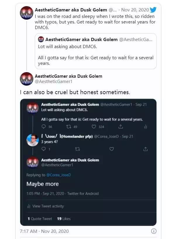 根据业内知名舅舅党DuskGolem,对《鬼泣》系列下一作的等待可能需要非常长的时间。在评价Capcom最近的泄露资料时,DuskGolem表示《鬼泣6》是多年之后的事情了,可能要超过4年。 ![]() 由于《龙之信条2》似乎在开发中,在Capcom2022财年内发售,因此《鬼泣》系列新作在本世代主机末登场的可能性比较大。值得一提的是,《鬼泣5》同样也是在PS4和XboxOne世代末期登场。 ![]() 除了《鬼泣6》外,DuskGolem还谈到了最近Capcom泄露的其他游戏: 《生化4:重制版》:等的时间可能更长一点 《生化危机:代号维罗妮卡》不重制 《生化危机:启示录》:会重制,我知道一些细节,但目前不便透露 《鬼泣》系列最近作品是《鬼泣5:特别版》,是原版游戏的升级版本,加入了维吉尔作为可游玩角色,光追,传奇黑骑士模式以及更多其他内容。 (责任编辑:蚂蚁团队) |