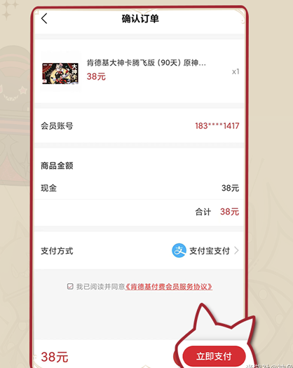 3、之后点击“立即购买”,勾选协议,确认订单,支付38元即可;