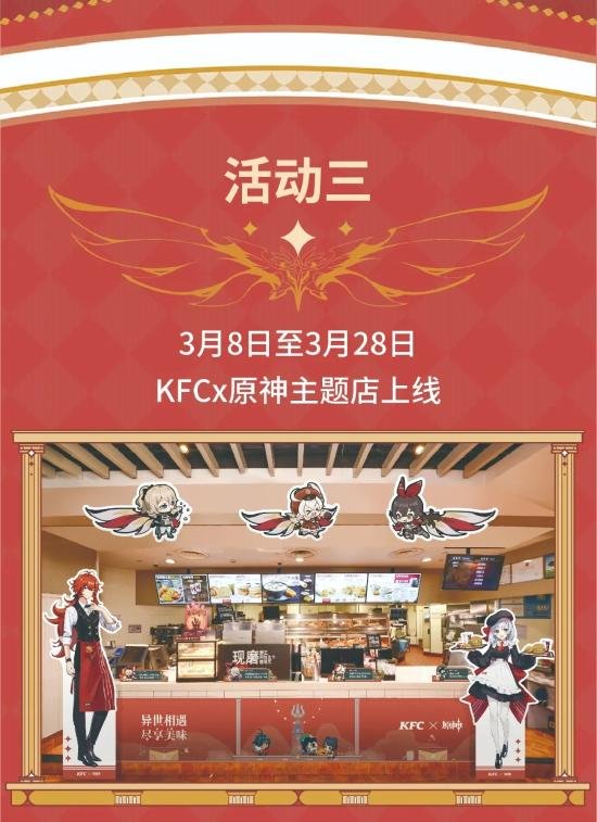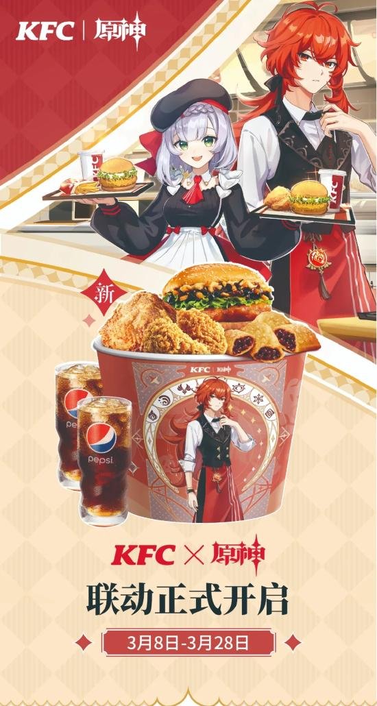 原神KFC正式开启,在肯德基购买指定套餐可以获得原神异世寻味礼兑换码,兑换限定款风之翼,那么具体情况是什么呢,一起来了解一下吧! 小辰帮大家总结一下本次联动4大内容: 1、联动风之翼皮肤兑换码 活动时间:3月8日~3月28日 获得方法:在肯德基购买指定联动套餐获得(内含翅膀皮肤、3万摩拉、3个食物),可以通过肯德基app、小程序、肯德基宅急送,美团外卖里买到,购买后兑换码会发到你的会员卡包或手机号内; 注意:兑换码要在3月17号更新1.4版本后才能在游戏里兑换使用,每个号只能领1次;