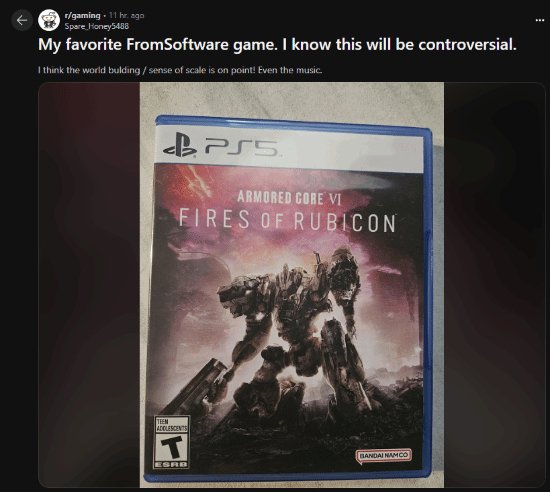 ![]() FS社以其经典史诗作品《血源》、《黑暗之魂》和《艾尔登法环》等而闻名。这些作品以背景黑暗、剧情复杂和操作难度高而著称,深受玩家们的喜爱。近年来,这些“魂游”类游戏成为了一大热门。 近日,一位Reddit论坛网友@Spare_Honey5488分享了自己最喜欢的FS社游戏,引发了网友们的热烈讨论。这位玩家表示自己最喜欢的不是近年大火的“魂游”系列,而是 FS社历史更为悠久的《装甲核心》系列中的最新作品——《装甲核心6》。 他提到,《装甲核心6》的世界观和规模感恰到好处,并称赞由作曲家星野康太领导打造的配乐令人赞叹。考虑到“魂游”系列在玩家们中备受瞩目,这位玩家还担心他的帖子会引起争议,但他只是出于分享自己喜欢的游戏罢了。 网友们纷纷留言表示理解他的选择,认为喜欢不同的游戏作品很正常,并不需要担心引发争议,那些只看重游戏销量和热度的玩家只是少数人。同时,也有很多粉丝表达了对《装甲核心6》的喜爱之情,赞扬它提供了丰富的武器与零件组装系统,并打造出紧凑高张力的战斗场面;复杂的机制也以更浅显易懂的方式展现给玩家。 发布于:北京 (责任编辑:蚂蚁团队) |