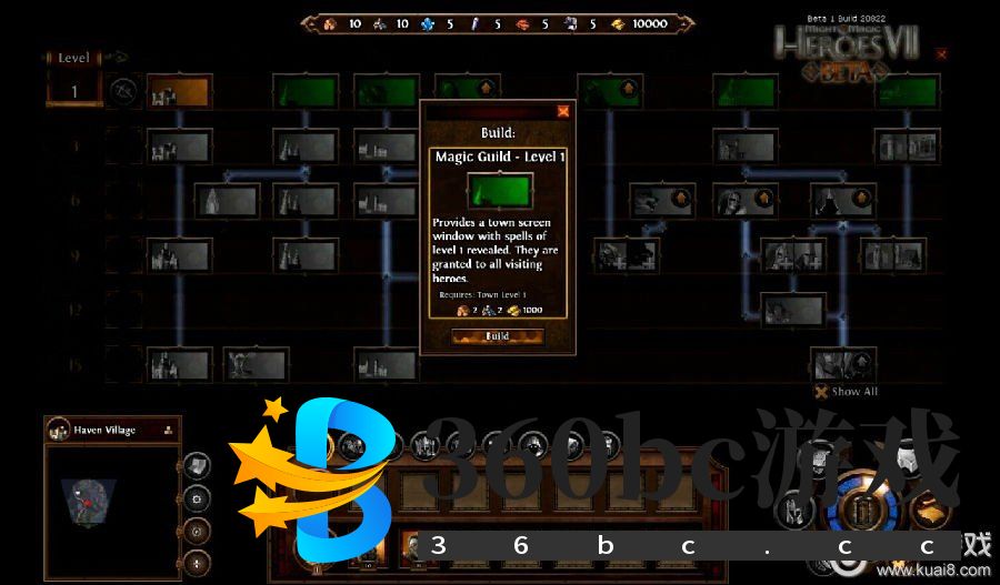 英雄无敌7的城镇视图变成了偏2D风格的漫画场景,这点小编觉得是M&M7变化比较大的地方,beta版的建筑建造升级界面也比较简化,是一个清晰的建筑树界面。黄色的代表已经建造至顶级,绿色代表可以建造,红色代表缺少材料,灰色代表前置条件尚未达成。