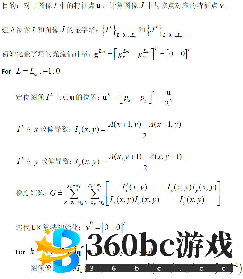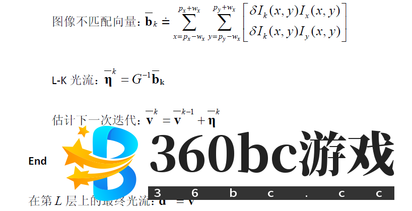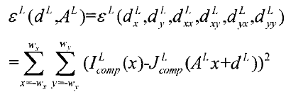 我们用数学的思想重新描述在L层和L+1层迭代运算,假定在第L层有对被跟踪目标的位置有个大致估计,而从第L+1层传递到L层的运动矢量,即光流计算初值为 为了在L层上计算光流和仿射变换矩阵,需要重新定义在L层上的匹配误差ξL: