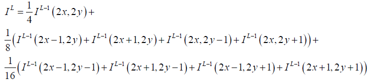 令I0 = I 是第 0 层的图像,它是金字塔图像中分辨率最高的图像,图像的宽度和高度分别定义为nx0 = nx 和 ny0 = ny 。以一种递归的方式建立金字塔:从I0中计算I1,从I1中计算I2 ,···。令L =1, 2,...代表金字塔的层数,L通常取2,3,4。IL−1 是第L−1层的图像,nxL−1 和 nyL−1分别是图像IL−1 的宽度和高度。图像IL可按如下方式由IL−1 求得: 即用一个[0.25 0.5 0.25]的低通滤波器对IL-1进行卷积。