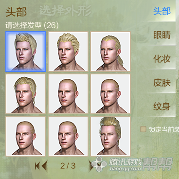 第二步 初始选择: 进入角色创建界面后,会看到,界面左边,有头部、眼睛、化妆、皮肤、纹身这几个选项