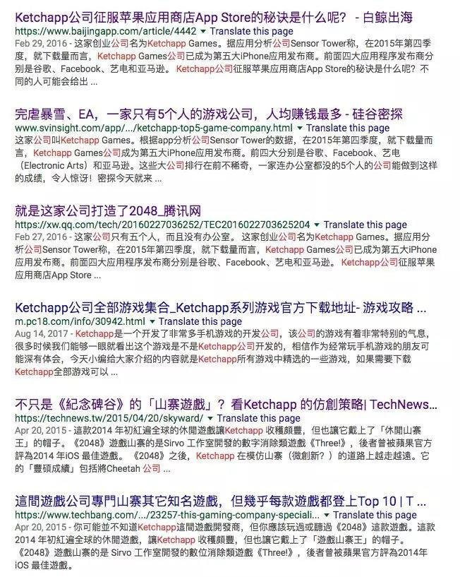 根据App分析公司Sensor Tower的数据,在2015年第四季度,就下载量而言,Ketchapp Games公司成为第五大iPhone应用发布商。前四大分别是谷歌、Facebook、艺电(Electronic Arts)和亚马逊。而据当时的媒体报道,它还是一家连办公室都没5个人的公司。 在Google中搜索“Ketchapp公司”,几乎全是这样的新闻标题,大家感受一下: