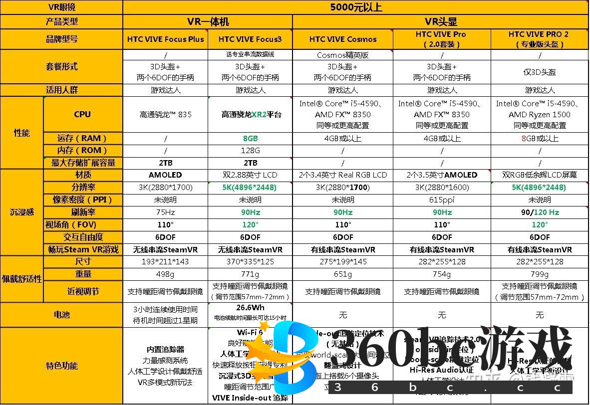 其实,缺点都是相对而言,如果你是不想折腾的小白,那么还是劝退你;如果你是沉迷VR的资深玩家或者爱折腾肯折腾,那么quest2绝对是个再好不过的选择,而且一体机里我就推荐你这款。远离扛精哈~ ![]() 推荐星级:★★★★☆ ![]() HTC VIVE Focus3 (新品上市) ![]() Focus3 是HTC最新上市的 VR一体机,升级迭代到原来的Focus PLUS。无论是从视觉、听觉体验上,还是人体工程学舒适度上,还是从空间规模追踪精确度上,都有了极大提升,处于行业领先水平! 可以独立运行,也可以通过软件与电脑串流SteamVR。 1、屏幕上(行业领先水平!): ① 搭载了两块2.5K分辨率屏幕,双眼分辨率达到行业领先的5K(4896*2448),是我推荐的其他型号没有的高清晰画质;相较上代的Focus Plus,Focus 3的屏幕分辨率提升了260%,明显地消除了纱窗效应。 ② 高达120°视场角的广阔视野(独特优势);流畅的90Hz刷新率,带来沉浸式体验。 2、性能上:Focus 3搭载了性能强劲的高通骁龙XR2平台,并配备 8GB运行内存(所有推荐的一体机中运存最大的)。相比上一代 Focus Plus所使用的前代骁龙XR平台,骁龙XR2性能显著提升,包括2倍的CPU和GPU性能提升、11倍AI性能提升。 3、音效上:沉浸式3D空间音频 采用全新开放式扬声器,Hi-Res 认证音频,内置2个具有专利的双驱动单元,音效的体验较上代更为的逼真和沉浸。 4、人体工学平衡设计,其实你要知道越是高级的VR设备,越重视人的舒适性体验。舒不舒服这点重要性玩VR的都知道! Focus 3本身续航能力能达到15个小时,长期佩戴也不会觉得累;眼镜舒适度也可以调节,57mm~72mm瞳距调节范围做的特别广,佩戴眼镜没问题;获得专利的快速释放头带设计,带有易于使用的调节拨盘,创新的配重设计,绝对让你带的舒服。 5、散热系统也做了优化,采用高性能的热传导铜管和冷却风扇系统,长期佩戴也能发挥最佳性能哈~ 6、精确的空间规模追踪功能,采用了HTC inside-out追踪定位,实现Room-scale精准定位。也因为是一体机,无需受限于PC,所以建议的定位空间扩大到10m * 10m。还是相当freestyle~ 使用要求就是需支持5G频道的无线网络,双频路由器。 推荐星级:★★★★★ (1)HTC VIVE Cosmos (普通版) <VIVE Cosmos 头显+一对vive手柄> ![]() (2)HTC VIVE Pro系列