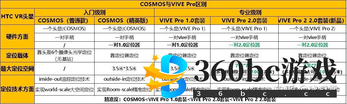 推荐星级:★★★★★ 2、如果的预算有限,也是个游戏超级玩家,那么选择VIVE Pro 1.0的套装,我觉得也很奈斯。两者的区别就在于定位器。 2.0的手柄可以在1.0和2.0基站下工作,1.0的手柄只能在1.0基站下工作。 ![]() 推荐星级:★★★★☆ 3、VIVE Cosmos作为资深游戏玩家,有了上面Pro 2.0的存在,就显得Cosmos有点坑了。 虽然VIVE Cosmos硬件在整个行业也算不错了,但是其靠头盔定位,没有基站,定位肯定不会像有基站的精准,当然,价位上也是比Pro 1.0 少了2K人民币,那也没话讲了。建议想要更极致游戏体验的玩家选择更贵的头显,替你们避坑了! (3)对了还有一款Cosmos的精英版: <VIVE Cosmos 头显+一对1.0定位器+一对vive手柄> 推荐星级:★★★☆ Cosmos的精英版采用outside-in定位技术,实现Room-scale精准定位。用的是和VIVE Pro 1.0套装一样的1.0基站,最大定位空间可以实现3.5米*3.5米。 定位技术既然一样的情况下,两款间我依然推荐VIVE Pro 1.0套装,性价比更高! 为啥? Cosmos的精英版 VS VIVE Pro 1.0套装 从音效上,VIVE Pro是通过 Hi-Res Audio 认证的头戴式设备和耳机,结合3D立体空间音效,听觉盛宴的沉浸感强于Cosmos的立体声耳机(类似于插电脑上那种耳机) 从屏幕上,VIVE Pro上2个3.5英寸AMOLED屏,一般认为色彩和对比度略强于Cosmos2个3.4英寸 LCD屏。 两款都采用人体工学提高舒适度,Cosmos上的特色翻开式面罩的设计,不用在玩的过程中摘戴,这点也算其的亮点。 另外,从游戏稳定性方面,VIVE pro作为专业级也会更好。 再一看价格,配置综合更好的VIVE Pro 1.0套装,定价还卖的比Cosmos精英版更便宜,如果你在这两个套装上犹豫,果断推荐 Pro 1.0套装哈~ (4)HTC VIVE PRO 2 专业版套装2.0 ——新品上市 ![]() 这个套装和上面提到的2.0套装,定位器2.0和手柄都是一样的,区别就在于这次的VIVE Pro头显从 Pro 1(也就是上面1.0、2.0套装里的头显)升级到 新上市的 Pro 2,到底升级的卖点在哪? 新品 Pro 2不出意外,和一体机的新品 Focus3一样,屏幕水平做到了行业领先!带来PC-VR的新一代视觉效果和音频体验。人体工程学设计有进一步升级和调整,跟符合人体舒适感。 1、屏幕行业领先水平