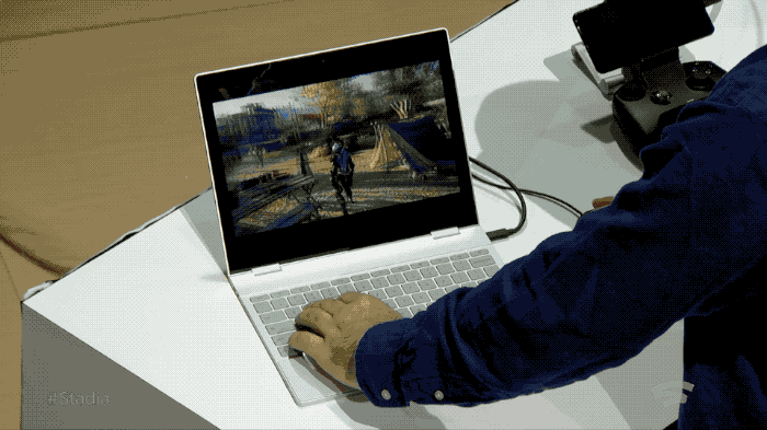 现场展示了这样一个片段:测试人员先是在一台笔记本上试玩《刺客信条奥德赛》,几分钟后他换成了一台 Pixel 手机,而当前的游戏进度也随之从笔记本转移到手机上,整个切换在数秒内就能完成。