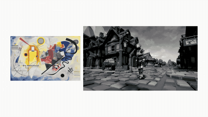 首先是 StyleTransferML,这是一种基于机器学习的 AI 技术,可以将不同的美术风格画面实时应用在某个游戏原型中,现场就尝试将梵高的印象派画风套在了一个机器人游戏上。
