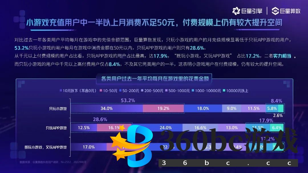 打起广告毫不咸鱼的《咸鱼之王》 那么,如果更多策略相似的大厂之作前来参战, 加剧的营销竞争恐怕会给小微选手带去不小的压力。 更不必提大厂游戏本身具备内容体量的优势——说到底,小游戏增重其实是增在了新来的“和尚”身上,中小团队仍然面临着跟进竞争导致的成本命题。 而对于全副武装进场的大厂商们而言,小游戏“以小搏大”的“小”原本应是成本的“小”。 大公司加码小游戏的初衷,恰恰反映了近年来行业普遍收缩的现象。游戏企业在立项和研发投入方面前所未有得谨慎,人人都在勒紧裤腰带过日子。而小游戏之所以显得如此诱人,正是因为它具备更短的研发周期,且开发和买量成本比App端游戏更低廉。 但看似美妙的情况也在发生变化。随着先机红利释放,越来越多的厂商加入战局,小游戏的买量成本注定水涨船高,如同内卷加剧的App游戏一般难逃市场规律。 当买量成本提升后,原本被傲人性价比所掩盖的缺憾也暴露了出来。 比如,小游戏用户的付费表现要弱于App游戏用户,用户忠诚度也远不及后者。 根据《2022抖音小游戏用户洞察报告》,只玩小游戏的用户月充值规模显著低于只玩APP游戏的用户。53.2%只玩小游戏的用户每月在游戏中消费金额在50元以内,作为对照,这一比例数字在只玩App游戏的用户中仅为28.6%。