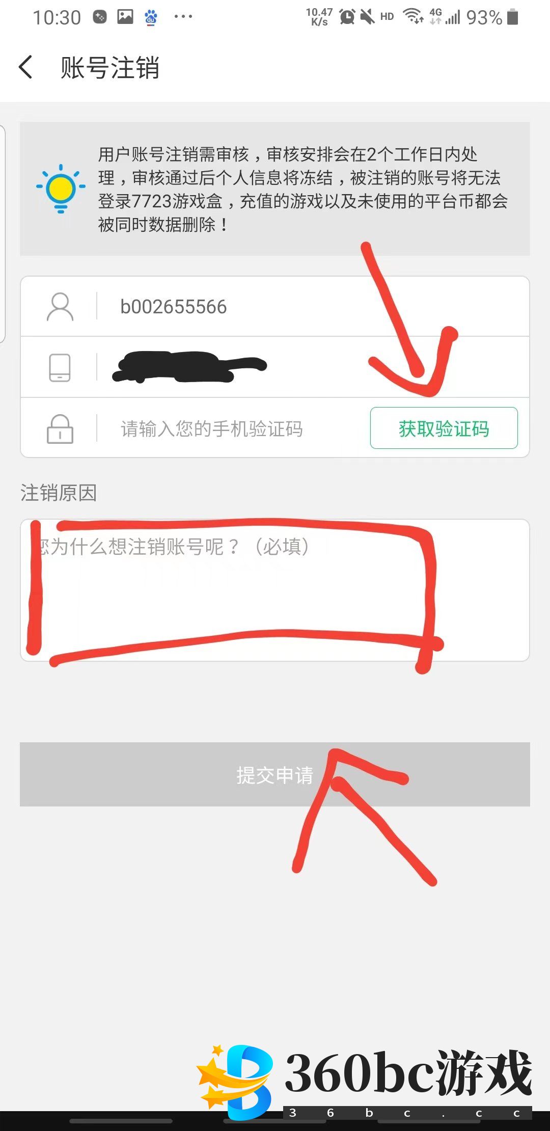 5.进入账号注销界面获得手机号验证码,填写注销理由,提交申请,另外用户账号注销需审核,审核安排会在2个工作日内处理,审核通过后个人信息将冻结,被注销的账号将无法登录7723游戏盒,充值的游戏以及未使用的平台币都会被同时数据删除!