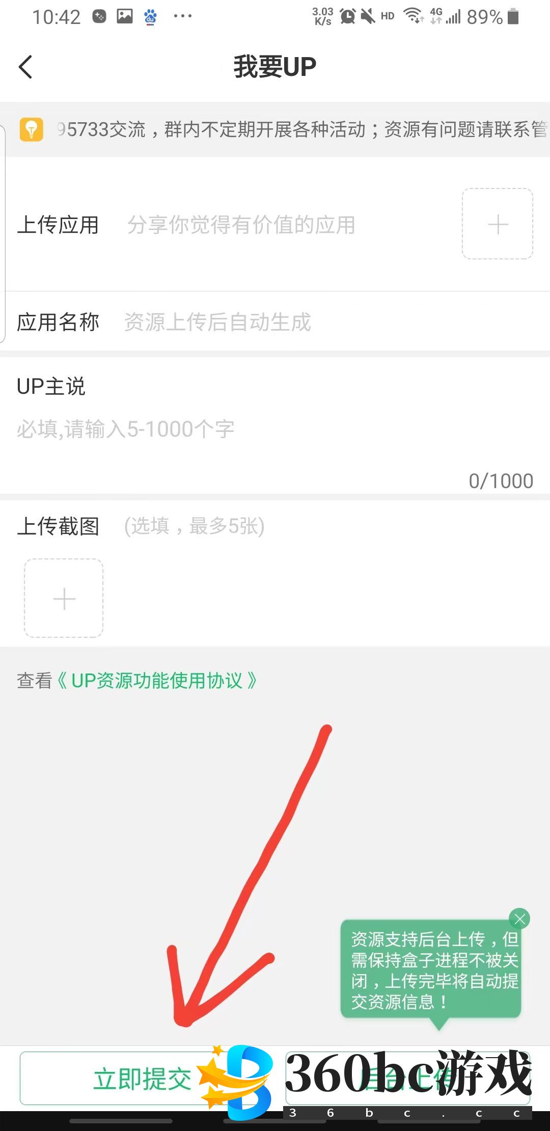 4.填写自己想要发布的资源,填写名称,介绍,截图,后台上传apk或其他格式文件,最后点击立即提交