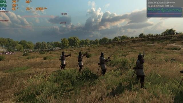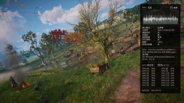 4K分辨率最高画质下,游戏整体流畅度可以达到40fps以上,略微降低一些阴影之类比较吃显存的画质选项,就可以达到更高帧数。 《骑马与砍杀2》虽然出来时间比较久了,但笔者一直在玩这款游戏,所以也顺手用华硕灵耀X双屏Pro测试了一下。