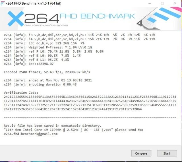 H.264视频编码性能方面,完成2500 frames编码用时48秒,帧率为52.43fps。在各类专项指令集以及自身强劲性能加持之下,酷睿i9-11900H处理器在视频编码方面的表现非常出色。