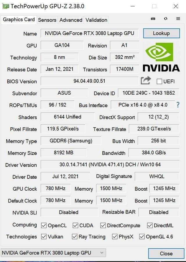 根据GPU-Z检索来看,RTX 3080独显采用了GA104核心,拥有6144个流处理器、256bit总线带宽、384GB/s带宽,8GB GDDR6显存,默认频率780MHz,显存频率1500MHz,Boost频率1245MHz,图形性能出众。