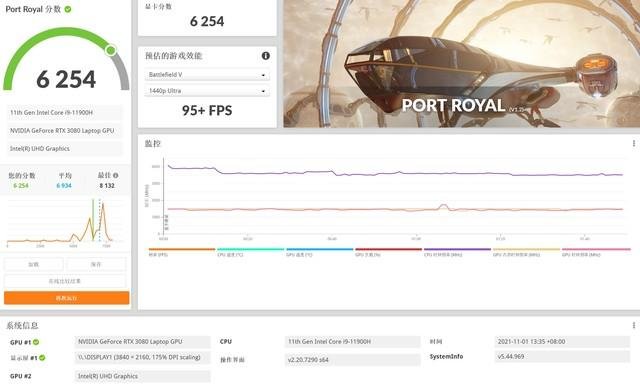 依然是最高画质,4K分辨率,平均帧数接近127fps,运行相当流畅。 总体来说,华硕灵耀X双屏Pro不仅能够胜任专业领域的视频、绘图、渲染等任务,同时也能满足普通用户的游戏需求,是一款无短板的全能水桶机。 ·综合性能表现优异 为良好体验奠定基础 最后按照惯例,还是来看看这款产品的整体性能表现究竟如何? 我拿到的这款机器配置了英特尔11代酷睿i9-11900H处理器、32GB DDR4内存、1TB PCIe 4.0 NVMe SSD以及NVIDIA GeForce RTX 3080 Laptop GPU,这套配置无疑是目前笔记本产品的高端配置,下面我们来看看实测情况。