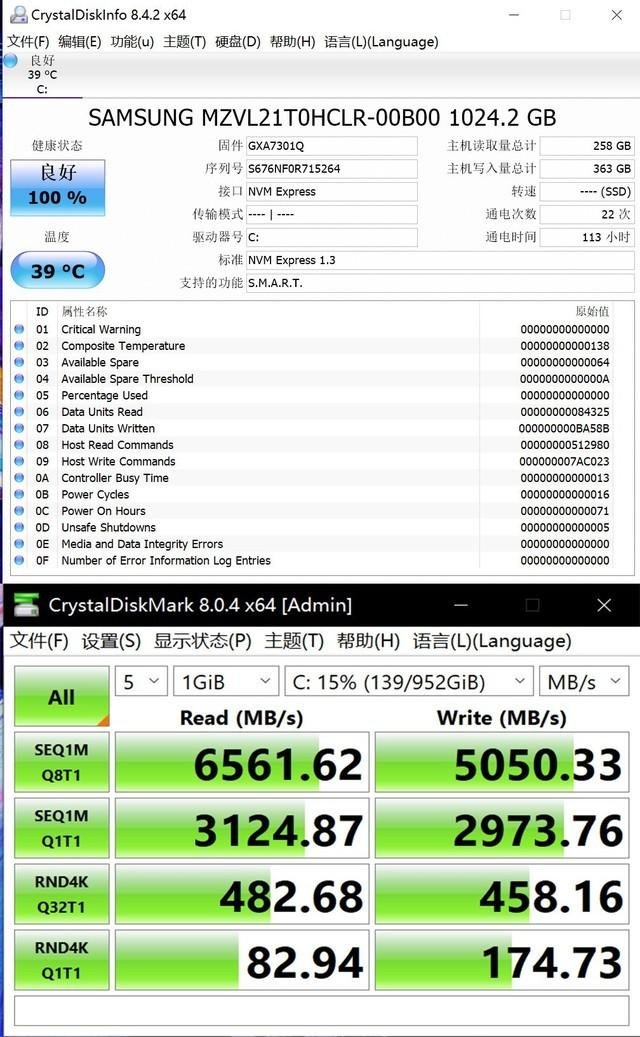 Time Spy DX12模式图形分:9784分、总分9061; Port Royal光追模式图形分:6254分; Fire Strike Extreme模式:12856分、总分12039。 从3DMark各项测试可以看出,华硕灵耀X双屏Pro可以轻松胜任DX 12游戏需求,可以满足光追游戏的流畅运行需求,同时可以很好地胜任大型3A游戏在高画质下流畅运行的需求。不过由于采用了Max-Q显卡,所以建议大家玩游戏时可以适当调低分辨率,以获得更高的帧数表现。 英特尔11代酷睿处理器支持20条PCIe 4.0 CPU直连通道,就为冲破整机性能瓶颈奠定了坚实基础。华硕灵耀X双屏Pro配备了一条三星1TB PCIe 4.0固态硬盘,下面我们来看看它的性能表现。