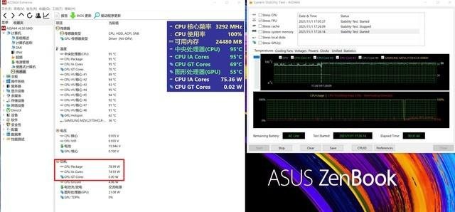 最后的综合性能方面,我们使用PCMark 10 Extended模式对其进行了评估。从结果可以看到,华硕灵耀X双屏Pro在常用基本功能,包含Web浏览、视频会议、应用程序启动等得分为9373分,这个分数在目前的同类产品中表现不错;而在生产力项目测试中得分为8707分,说明其完成电子表格、文档工作没有压力;数位内容创作方面,NVIDIA GeForce RTX 3080 Laptop GPU为其提供了不错的图形能力,其评分达到9605分,说明其完成图片、视频、图形渲染等工作没有太大压力;游戏性能评分则达到了17069分,另外其综合得分为8388分,各项性能体验非常全面,没有明显短板。 ·散热性能评估 华硕灵耀X双屏Pro可以给到用户最佳的体验,但是双屏设计对于散热会有更高的要求,毕竟副屏下方就是主板区域,虽然采用了抬升式设计,但热量过高也会对其有所影响。那么这款产品的散热表现如何呢?接下来我们对其进行了满负载的CPU单烤机和CPU+GPU双烤机测试。