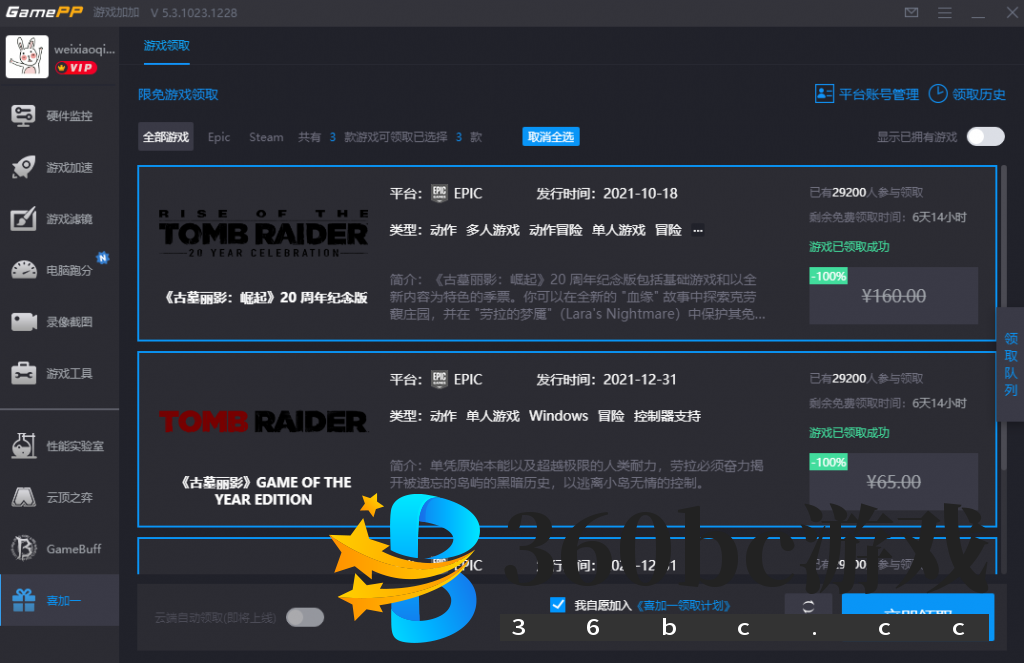 Epic、Steam平台将不定期更新免费游戏,不想错过每一款免费游戏,赶快下载游戏加加使用喜加一功能免费领游戏吧,所有免费游戏一网打尽,助你天天都能喜加一! ![]() 游戏加加喜加一免费领游戏操作步骤: 1.游戏加加官网:下载最新版本游戏加加; 2.点击客户端“喜加一”模块; ![]() 3.绑定您的epic、steam平台账号; 4.点击“立即领取”,即可免费领游戏啦。 ![]() Epic、Steam平台不定期更新免费游戏,赶快下载游戏加加试试吧!关注游戏加加微信公众号实时掌握各大平台游戏限免动态! (责任编辑:蚂蚁团队) |
