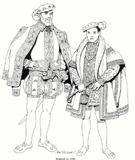 16世纪常见的切口装饰处理 《人类革命》中女性服装的设计则是文艺复兴时期服装风格未来化的重头戏,她们大都会采用名为“拉夫”的领部装饰,呈车轮状造型,周边是8字形连续的褶,外口边缘处用花边和雕绣作装饰。拉夫领的制作工艺十分复杂,需要特制的工具来完成造型,因此拉夫领也被当做贵族象征。