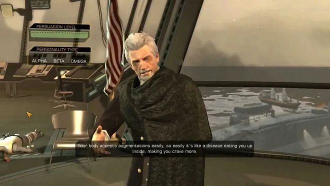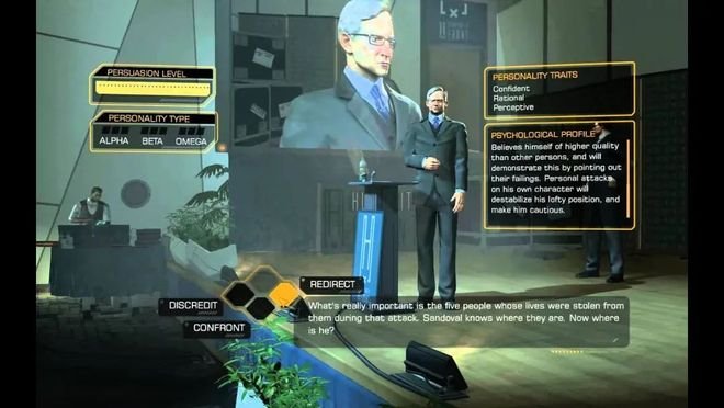 《人类革命》的玩法比较依赖文本翻阅,如果玩家不在游戏中保持好奇心,很多内容都会被错过 《人类革命》在对话系统上的发挥也使得对话像是谜题一样。刚上手时,你以为和NPC的对话只是在唠嗑,但很快你会发现,如果不慎重选择和NPC的对话,甚至会导致任务失败。 游戏拥有单独为对话系统服务的强化义体“社交强化器”,使用起来非常酷,它会扫描和监控社交对象的虹膜、心肺、心率等指标,判断对象当前的情绪,并且通过系统演算出对象的性格特征,以α、β、Ω三个人格类型,帮助你选择对象最符合的选项。你还可以在适当时机向NPC索取一些利好条件。