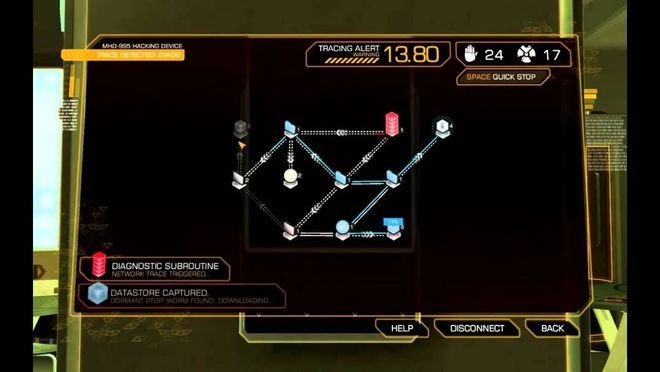 不过《人类革命》在线路多样性设计上有些过度依赖通风管道,因而被玩家戏称为《杀出通风管》 这只是简单的举例,现实情况可能会更加复杂,比如: 可以钻入的通风口被大型设备挡住,需要你升级自己的手臂强化来举起重物; 当你想要从下水道绕行时,下水道有可能出现毒气泄漏,你要么打开智能视觉找到毒气的阀门,要么升级自己的呼吸系统来免疫毒气伤害; 目标建筑物的后门被一道强力安全锁锁住,需要你升级自己的黑客能力来破解。 说到黑客,《人类革命》拥有一个有趣的黑客小游戏,虽然本质上只是一个棋盘解谜,但因为加入了插件机制和警报系统,黑客小游戏足够好并且发挥了重要作用,同时也不至于干扰到玩家的注意力。