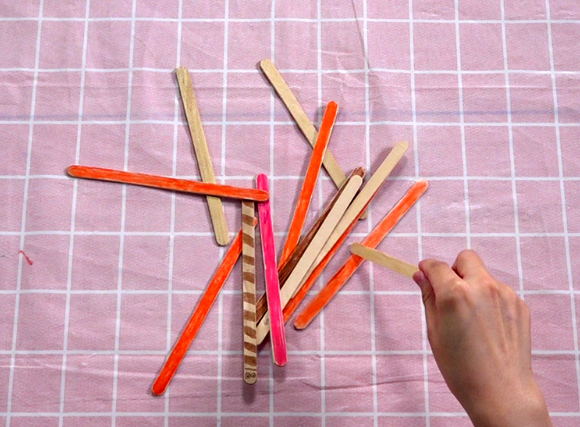 将所有冰棒棍抓在手中,垂直于桌面散开,轮流将冰棒棍一根根地挑起来或用手直接取回,但不能动到或碰到别的小棒,谁挑到的冰棒棍最多则获胜。