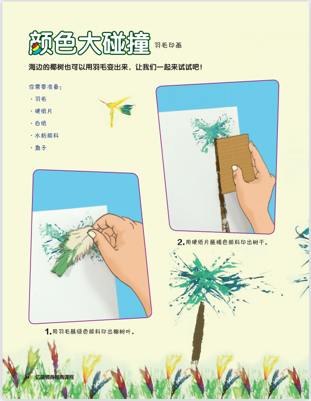 海边的椰树也可以用羽毛变出来,让我们一起来试试吧! 你需要准备: 羽毛、硬纸片、白纸、水粉颜料、盘子。 游戏步骤: 1.用羽毛蘸绿色颜料印出椰树叶。 2.用硬纸片蘸褐色颜料印出树干。 3.用羽毛蘸彩色颜料印出花朵。 4.用羽毛蘸彩色颜料印出小鸟。