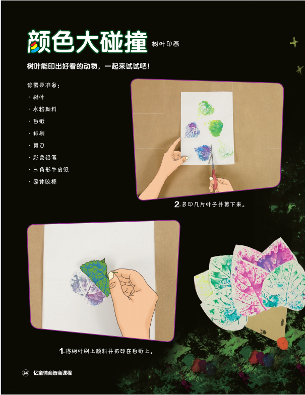 树叶能印出好看的动物,一起来试试吧! 你需要准备: 树叶、水粉颜料、白纸、排刷、剪刀、彩色铅笔、三角形牛皮纸、固体胶棒。 游戏步骤: 1.将树叶刷上颜料并拓印在白纸上。 2.多印几片叶子并剪下来。 3.拼成好看的形状作动物的身体,贴在三角形牛皮纸上,再添画出眼睛、鼻子和触须。