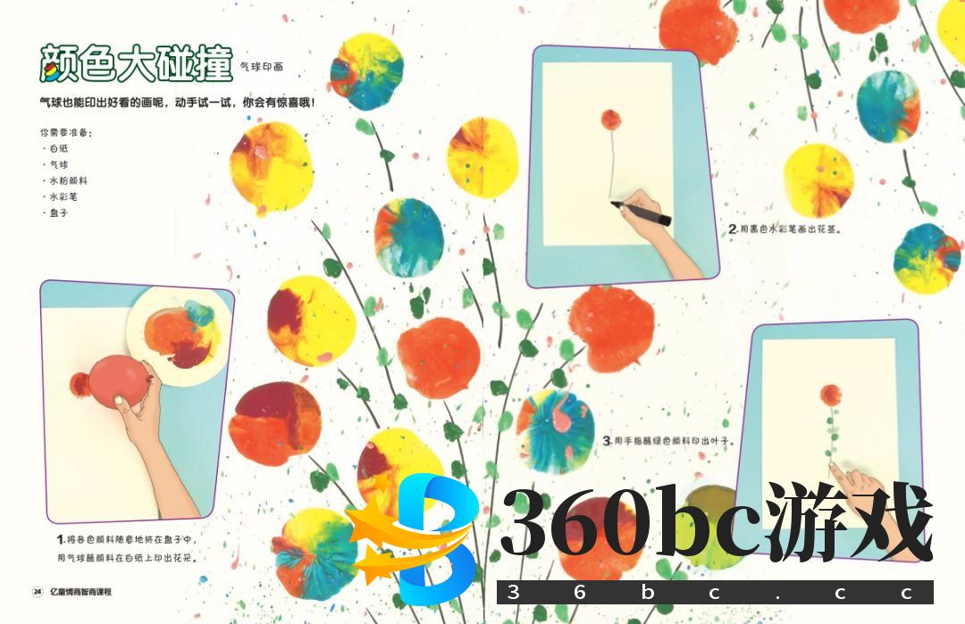 气球也能印出好看的画呢,动手试一试,你会有惊喜哦! 你需要准备: 白纸、气球、水粉颜料、水彩笔、盘子。 游戏步骤: 1.将各色颜料随意地挤在盘子中,用气球蘸颜料在白纸上印出花朵。 2.用黑色水彩笔画出花径。 3.用手指蘸绿色颜料印出叶子。