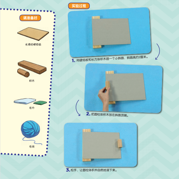 你需要准备: 光滑的硬纸板、积木、毛巾、毛线。 实验步骤: 1.用硬纸板和长方体积木搭一个小斜面,斜面高约2厘米。 2.把圆柱体积木放在斜面顶端。 3.松手,让圆柱体积木自然滚下来。 活动思考: 1.下列哪种情况“车轮”滚得最近,哪种情况滚得最远?