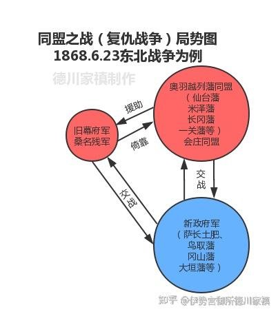 引言: 习惯上,我们常常以“倒幕战争”来简单概括1868-1869年的日本内战(戊辰战争),也将战争中对立的双方简化为“新政府”和“旧幕府”。一般而言这样的概述无可厚非,在交谈和转述时没有问题。然而但不够严谨,在正式的场合下也以上述概述来探讨这场对日本意义重大的战争,这便是犯了学术上的错误,容易误导他人。 因此我在这篇文章中不仅更多的采取幕府侧的视角研究这场决定日本命运的战争,以改变传统的仅从一方视角看待问题——只谈新政府军如何胜而不谈幕府军如何败;并且提出一个新的观点,即“三分戊辰战争”,将戊辰战争分为三个阶段和三方势力来分析。 三个阶段即幕府之战(权力战争)、同盟之战(复仇战争)、武士之战(统一战争),括号外的是以旧幕府方的视角描述战争的主体,括号内的是对萨长新政府建立的日本的影响概括。 三方势力即萨长新政府、旧幕府、奥羽越列藩同盟。需要特别强调的是,这三方势力是一个概括性称呼,并且在战争的三个阶段的名称也不尽相同,将在下文详细体现。 ![]() 一.幕府之战(权力战争) 这一阶段的战争从鸟羽伏见之战爆发开始,到上野之战结束为止。时间是1868年1月27日——1868年7月4日(和历庆应4年1月3日到庆应4年5月15日)。 1. 战争始末 进入1866年,京都局势变得异常紧张,“尊王攘夷派”已从最初的希望借助幕府联合各藩实现攘夷,转变为要以天皇为中心建立新政权,推翻幕府旧制来进而实现攘夷。与之针锋相对的是“公武合体派”,认为以天皇为首的公家和以幕府将军为首的武家在国家危难之时不应该对立,而应该联合,并最终合并行成一个统一的新政府。1867年11月9日,德川庆喜大政奉还,宣布将政权还给朝廷。随后在1868年初,由于朝廷方的猜疑,以岩仓具视为主导的公卿再度发起小御所会议,提出“王政复古”,京都随即被萨长等倒幕藩把持。德川庆喜要率军上洛亲自向天皇叙职。两派的矛盾尖锐不可调和,新政府军在京都近郊的鸟羽、伏见两个地区部署重兵准备阻击上洛的幕府军,鸟羽伏见之战爆发,戊辰战争就此拉开序幕。 所谓幕府之战,是由于此时的主力是幕府军,对阵萨长新政府军队,主体是“旧幕府”的意志,以战争中幕府的独立意志来定义始末;且这是一场决定日本国内局势的战争,一方是萨长两藩建立的新政府要通过战争手段实现“王政复古”,另一方是德川幕府的军队携《讨萨表》上洛要求“清君侧”。获胜者将占据地利把持朝政号令天下,故又称为“权力战争”。若幕府方胜利,则会使德川家的统治再延续一段时间;这段时间很可能会成为幕府改革制度的良好时机,如果德川庆喜等开明派的改革顺利,将可能把日本塑造成我们不可想象,与现在地位、文化截然不同的国家。若新政府军能首战取胜,便可以大获支持,有能力继续推进倒幕战争使推翻旧幕府形成摧枯拉朽之势。 历史的车轮驶向了后者。驻守在鸟羽的萨长军队率先向幕府军开火,战争伊始便陷入了混乱似乎预示着幕府军的结局。新政府的胜利使鸟羽伏见之战后果然其合法地位得到了极大稳固,一些对战局表示观望的藩陆陆续续地加入到了新政府的行列,其中如津藩、鸟取藩、诹访藩等。 鸟羽伏见幕府军的战败之因在前作中已经详细论述,大致有三点,概述即是幕府军未做好充分的作战准备,指挥上出现的重大失误,以及锦之御旗出现后导致的巨大的心理落差。这里不展开介绍,详谈大众关于这场战役的误区。对于鸟羽伏见之战的常见误解存在于两个方面。一是幕府军的准备状况,二是幕府军使用的武器装备。在准备方面,由于禁门之变时向朝廷出兵的长州藩被指认为朝敌,在朝廷权威空前加强的幕末时代,德川庆喜忌惮于向天皇所在的皇宫开火,于是命令部队仅携带少量弹药并在行进时步枪不上膛,以免走火导致不可控的局面。同时幕府军内的一些将领认为只要兵力占有绝对优势的幕府军不率先发难,萨长军队不敢向幕府军主动攻击。在孝明天皇死后,此时的德川庆喜还没有拜见过明治天皇,于是幕府军打出“觐见新皇”寄希望于行军列阵后萨长军队自行让路,德川的军队便可顺利抵达皇宫挽回朝政。然而结果是萨摩藩、长州藩在幕府军上洛沿途布下严密的防卫,并且命令炮兵率先向幕府军的行军队伍展开炮击,导致幕府军顿时陷入混乱,首战失利。随后新政府军举起了岩仓具视伪造的锦之御旗,打击了幕府军的士气,也动摇了德川庆喜的态度。最终导致了德川庆喜率重臣返回江户,幕府军失败撤出鸟羽伏见的战场。 2.伪之锦旗 为什么说锦之御旗是伪造的呢?这是由于在戊辰战争爆发前,倒幕派公卿岩仓具视暗地联系萨长从事倒幕活动,作为朝廷中的一员,他不断以朝廷的名义为萨长的举兵争取合法性,其中锦旗就是这一形势下的产物。传说锦之御旗曾在镰仓时代承久3年的承久之乱中,首次被后鸟羽上皇配发给了讨伐镰仓幕府的队伍,受命为官军。此后几乎再无使用的记载,并且也没有现成的锦旗保存在皇宫内。而岩仓具视为了让萨长藩的军队也成为官军,便根据镰仓时期的传说片段,在甚至不知道历史上锦旗样貌,根据自己的理解命女工缝制了锦之御旗。这面暗地里制作的旗帜,既没有得到朝廷的批准,也没有得到天皇的授意,自然是伪造的了。然而幕府军上下也没有听闻过何为锦旗,在鸟羽伏见之战时萨摩藩士兵一边举旗锦