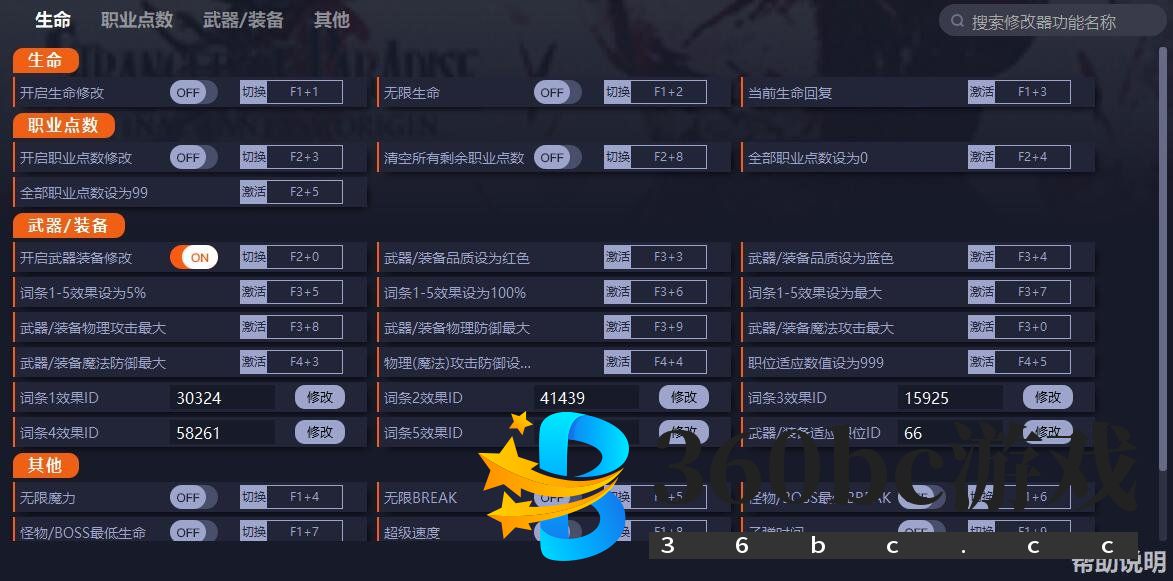 注意事项: 1.单人游戏使用。 2.无限职业经验:开启后,获得职业经验生效。 3.开启职业点数修改:触摸魔方或世界打开游戏菜单[Esc],职业技能树后修改。 如果技能树全部点完,还有剩余职业点数,进入职业技能树会崩溃,解决方法,"开启职业点数修改"开启后,再将"所有剩余职业点数归零"开启,再进入职业技能树界面即可。 4.素材无限:生效的素材数量需大于1,游戏场景或世界地图打开游戏菜单[Esc],点击道具一览,切换至素材背包[2]生效。 5.开启武器/装备修改:打开游戏菜单[Esc],点击道具一览,鼠标移至道具列表要修改的武器/装备上使用修改项,武器/装备修改后需重新装备一下。武器/装备品质与适应职位ID修改对白色(无色)品质的武器/装备无效。 1.先开游戏,再开修改器。 2.了解修改器使用说明。 3.开启修改器各主初始项再使用各子修改项[无主初始项则不用开启][主初始项:如开启...修改]。 4.使用修改项[无法开启查看修改器使用说明]。 5.键位功能里数字键一般为字母键上方。 F1+1开启生命修改 F1+2无限生命 F1+3当前生命回复 F1+4无限魔力 F1+5无限BREAK F1+6怪物/BOSS最低BREAK F1+7怪物/BOSS最低生命 F1+8超级速度 F1+9子弹 F1+0治疗剂/素材不减 F2+1光明启示无限持续 F2+2无限职业经验 F2+3开启职业点数修改 F2+8清空所有剩余职业点数 F2+4全部职业点数设为0 F2+5全部职业点数设为99 F2+6素材无限 F2+7铁匠铺强化无素材要求 F2+9共鸣持续时间不减 F2+0开启武器/装备修改 F3+3武器/装别品质设为红色 F3+4武器/装备品质设为蓝色 武器/装备词条1-5效果ID修改 F3+5词条1-5效果设为5% F3+6词条1-5效果设为100% F3+7词条1-5效果设为最大 F3+8武器/装备攻击最大 F3+9武器/装备物理防御最大 F3+0武器/装备攻击最大 F4+3武器/装备魔法防御最大 F4+4武器/装备物理(魔法)攻击防御设为100 武器/装备适应职位ID修改 F4+5武器/装备职位适应数值设为999 《最终:起源(Final Fantasy Origin)》是一款RPG游戏,丰富的角色自定义、大量可互换的职业设计,玩家可以随心所欲的自由选择喜欢的职业。 提取码:3366 以上就是《最终幻想:起源》三十四项修改器一修大师版的基本内容,还想要了解更多内容吗,想要知道新手该怎么去玩该款游戏吗?想要了解跟多的话就来游戏爱好者下载吧! (责任编辑:蚂蚁团队) |