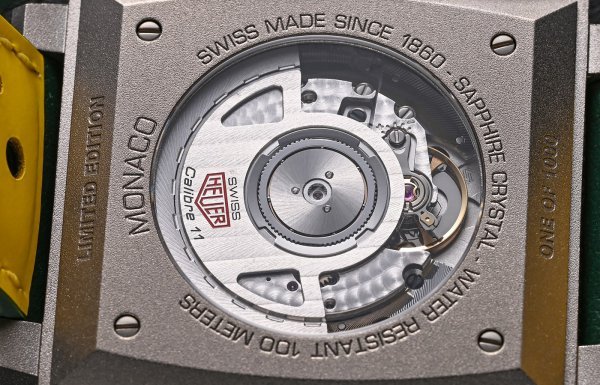 侧面设有两个复古计时按钮,分别为启动暂停、归零。与常规计时码表不同,这枚摩纳哥表款的表冠设于表壳左侧,颠覆了传统表冠设计。这种设计是因为初代摩纳哥腕表搭载了当年世界上第一枚模块式自动计时机芯——Chronomatic Calibre 11机芯,初代摩纳哥便将表冠移步至左侧,象征其计时表款无需手动上链,如今这枚表款便是延续这一标志性特征。