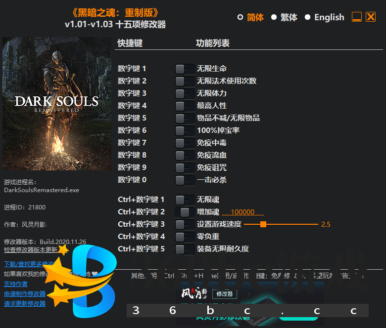 注意事项 1. 物品不减/无限物品在物品数量减少时生效,物品数量会修改为该物品的持有上限。如果消耗量等于该物品当前持有数量,此功能不会生效,该物品会正常消耗掉。 2. 100%掉宝率激活时会强制激活最高人性。 1.解压文件 2.启动游戏 3.启动修改器 数字键 1 - 无限生命 数字键 2 - 无限法术使用次数 数字键 3 - 无限体力 数字键 4 - 最高人性 数字键 5 - 物品不减/无限物品 数字键 6 - 100%掉宝率 数字键 7 - 免疫中毒 数字键 8 - 免疫流血 数字键 9 - 免疫诅咒 数字键 0 - 一击必杀 Ctrl+数字键 1 - 无限魂 Ctrl+数字键 2 - 增加魂 Ctrl+数字键 3 - 设置游戏速度 Ctrl+数字键 4 - 零负重 Ctrl+数字键 5 - 装备无限耐久度 《黑暗之魂:重制版》是一款类游戏,黑暗与深沉的世界观,用无缝连接的世界设定打破了阻隔,体验学习、克服、获得成就感的连锁效应。 以上就是小编为你们带来的《黑暗之魂重制版》十五项修改器风灵月影版,还想要了解更多相关应用软件的话,就来游戏爱好者看看吧!你会在这里找到更多精彩的内容,你还能够在这找到更多功能强大又简单好玩的软件。 |
