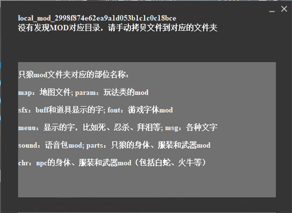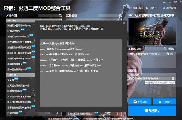 2、在本地框中选择想要加载的MOD,再点配置加载。 map:地图文件;param:玩法类的mod; six:buff和道具显示的字;font:游戏字体mod; menu:显示的字,比如死、忍杀、拜泪等:msg:各种文字; sound:语音包mod;parts:只狼的身体、服装和武器mod; chr:mpc的身体、服装和武器mod (包括白蛇、火牛等)。