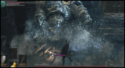 4、另一招式蓄力使用左手锤子横扫一个半圆,伤害较高,只要朝着冷冽谷的波尔多翻滚即可躲避。