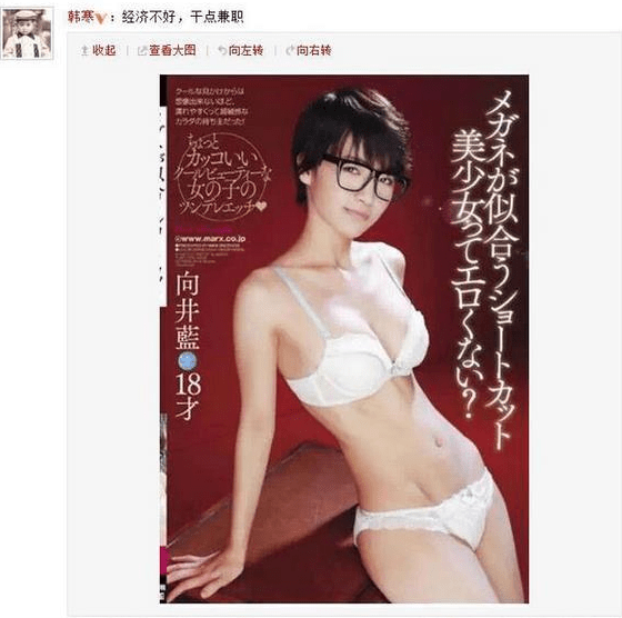 照片中的向井蓝穿着性感,短发戴眼镜的模样与韩寒相似度颇高。 话说,这位向井蓝同学在日本并不是很火,如果不是阅片无数,韩老司机怎么会发现跟向井蓝撞脸?!
