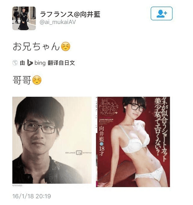 接下来奇葩的是,两天过后向井蓝居然翻了韩寒的版,在其个人社交网站上贴出自己与韩寒的照片,并留言叫“哥哥”,这可乐坏了吃瓜群众:“岳父征服岛国去了”,“跨国认亲的节奏!”