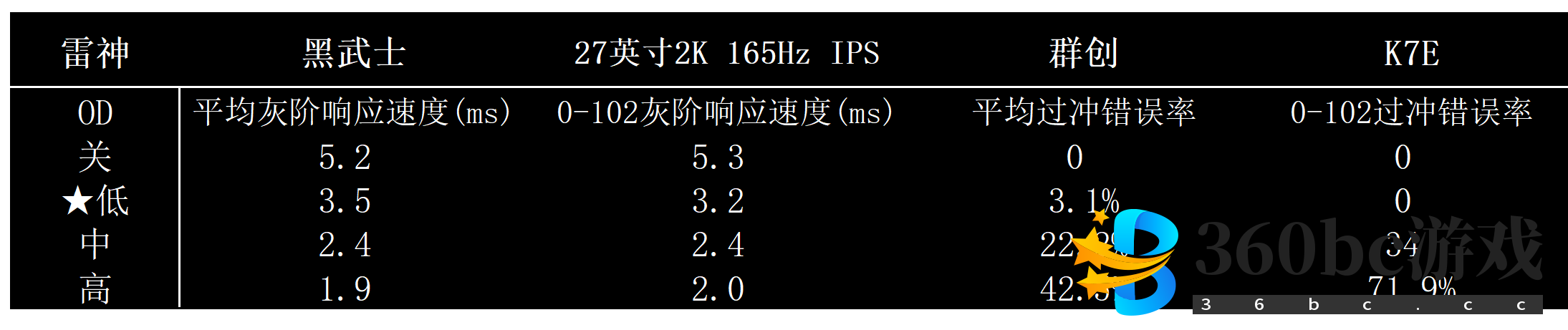 2023年4月更新,目前黑武士不再是100%群创K7E了,而是群创和BOE面板混用,以BOE面板为主,性能会稍微弱一点,价格便宜一些。 2021年夏天的雷神银翼(2K165)无论是从外观颜值还是性能上看,都是一个优秀的产品。但此后雷神一直没能拿出同样称得上“超级爆款”的优质显示器。 最近,雷神发布了新品黑武士显示器(型号DQ27F165L),它是27英寸2K170Hz游戏显示器,群创K7E面板,号称“1399元的价格,2000元的性能”。显然,雷神希望借此打造银翼之后的另外一个超级性价比爆品。 那么,黑武士真的很强吗?答案是肯定的。尽管它依然有缺陷,但在1399元的价位上,它就是天下无敌的存在。即便涨价到1699元,依然是同价位中最好的选择,没有之一。 注意:请务必阅读本文关于色域和亮度/对比度的内容,这台显示器很特殊,不像其他产品在默认模式用就可以,它的默认模式表现非常垃圾。 黑武士用的是船新模具,做工还算精致,比不少2000元的显示器还要好。比如AOC Q27G2S/D。 看底座就知道,它的设计风格基本就是仿照银翼的。 ![]() 背面也是仿银翼设计,偏向于电竞游戏风格。支架支持升降旋转。 ![]() 下面是银翼,和黑武士是不是很像? ![]() 接口是一个DP 1.4和两个HDMI 2.0。OSD按键改成了摇杆,好评!银翼到现在都没摇杆。 ![]() 0%-100%亮度都是DC调光不闪屏 支持抖10bit,用DP口可以输出2K 170Hz 10bit 硬件抗蓝光!值得好评,这也是黑武士最大的优势。目前有硬件抗蓝光的游戏显示器极少,上一个广受推荐的硬件抗蓝光还是惠普X27Q,但它的参数远不如黑武士。 硬件抗蓝光能在过滤有害蓝光的同时不会让屏幕泛黄,是真正有用的护眼技术。可惜目前99%的低蓝光显示器都是软件抗蓝光,纯废物,一开低蓝光就会让屏幕严重发黄。 (下图是黑武士光谱,是典型的硬件抗蓝光屏幕的光谱。一般硬件抗蓝光屏幕的蓝色波形都比较靠右侧,蓝光峰值大于450nm。) ![]() 实测发现,黑武士的415-455nm有害蓝光能量占400-500nm蓝光总能量的29.5%,按照TUV的标准,低于50%就是硬件抗蓝光,越低则越护眼。因而,我可以认为,黑武士理论上非常护眼!实际上也确实如此,黑武士的屏幕看起来非常柔和且舒适,即使长时间使用它来做文字工作,也不会让眼睛陷入疲劳。 支持色域切换,在OSD菜单——色彩——色域缩限中可以切换色域模式。默认是正常,还有DCI P3和sRGB两种模式。同价位大部分显示器都没有色域切换,雷神在这一点上从不马虎,顺便批评下AOC、飞利浦、戴尔、华硕、三星,他们要么不做色域切换,还要切换后把亮度锁死。 ![]() 默认的正常模式只是参数稍微好看点,94% P3覆盖,其实没屁用。这个模式的对比度亮度都极差。 P3模式有92% P3覆盖率,还凑合,对比度亮度也相对正常。建议玩大型单机游戏、绘图(Adobe PS软件等)、HDR游戏和HDR电影时用该模式。 sRGB模式是为了消除广色域从而解决过饱和问题,建议日常上网、办公时使用。当然,如果你和我一样不在乎过饱和的话,可以一直用P3模式。实际上,P3模式的广色域也不是很高,过饱和并不是特别严重。 正常模式最大亮度只有322nit,对比度660,辣鸡。诚然,K7E面板在对比度和亮度上确实不如友达8.2,但是660对比度实在说不过去,暗处细节贼差,黑的地方一片模糊。 P3模式和sRGB模式都有410nit+,接近900对比度,勉强达到及格水平。但是依然不够好,现在一些IPS也能达到1300对比度(比如联想入门级2K165显示器G27q),黑武士的900对比度确实不够看。 对比度不足,是黑武士最大也是唯一的缺点。 ![]() 再次建议,不要使用默认的正常模式。请使用DCI P3或者sRGB模式。 445nit,对比度大约1000,没有分区控光。 注意,只有HDR游戏或者HDR电影中才可以开启HDR功能,并且必须把系统和显示器中的HDR都打开。 平时请不要开HDR,因为大部分应用根本不支持HDR,强行开启HDR只会让屏幕泛白。 P3和sRGB模式均匀性不算好,偏差值都在7左右,不过正常使用中肉眼基本看不出明显差异。正常模式虽然均匀性好点(偏差值5),但是正常模式是废物,所以不考虑。 ![]() 正常模式deltaE均值0.9,最值3.1,但是这个模式没意义。 P3和sRGB模式均值也是0.9,最值5.1-5.3,算是中等偏上水平。 观感上稍微有点偏暖色。硬件抗蓝光屏虽然理论上不会发黄,但是实际上或多或少都会让屏幕偏暖。如果偏好冷色,可以在OSD中手动提高蓝色的占比,适当提高蓝色并不会改变或者削弱硬件抗蓝光屏幕的护眼效果。 这块屏幕虽然通透性不如LG屏,论色彩表现不如LG,但它的好处就是光线给人感觉柔和而舒适,完全不刺眼,这也是护眼屏的特征。 ![]() 黑武士有低延迟模式,开启后在120Hz下4.4ms延迟,是游戏显示器正常水平,无任何迟滞感;关闭则是120Hz下14.8ms延迟,有明显迟滞感。 因而,低延迟模式请一直保持开启! 开启低延迟模式的情况下,最极OD档位是「低」,响应时间3.5/3.2ms。这个水平和雷神银翼基本是一样的,都属于IPS显示器中的第一梯队。 中档位虽然可以达到2.4/2.4ms,但是有明显过冲,鬼影很多。 ![]() 如果关闭低延迟模式,各个档位的响应时间会降低大约10%(或者响应速度加快10%),但是输入延迟太高,因而得不偿失。 支持G-SYNC Compatible和AMD FreeSync 需要开启显示器中的Adaptive Sync才能开G-SYNC Compatible或AMD FreeSync,但是Adaptive Sync会让OD无法使用。也就意味着平均响应速度会掉到5.2ms。我建议,在FPS游戏中追求响应速度的话,不要开Adaptive Sync。而大型单机游戏中开启Adaptive Sync以获得更加顺畅