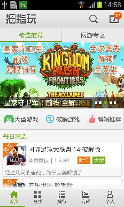 播报 编辑 海量游戏独家首发 拇指玩提供超过10万款免费的高可玩性安卓游戏的免费下载,很多款游戏都是独家发布。只要打开(拇指玩)应用,海量游戏任用户挑选,每天都会有最新的游戏(更新)上架,资源丰富更新及时,及时对处理用户的反馈意见。 精选游戏每日推荐 尽管拇指玩里的游戏资源繁多,但绝不繁琐。编辑们凭借对玩家心理和使用习惯的精准把握,从海量游戏中精挑细选、发掘推荐高品质游戏。让每一个玩家都能方便得挑选到自己最喜欢的游戏。例如,为了热衷于大型手机网络游戏的玩家拇指玩下载平台专门设置了大型游戏专区;对不同类别的游戏做了更加细致贴心的分类处理等。 大型游戏轻松安装 针对早期玩家反映,安装安卓大型游戏时,需要先下载游戏APK安装包,再下载游戏数据包,这一复杂过程让玩家叫苦不止。拇指玩独家创立的GPK格式,很好的解决了上述问题。全球首家实现大型游戏一键下载安装,自动适配用户的机型,省去了手动多步下载安装的烦恼。用户只需轻轻一点,一站式下载安装,几分钟就能玩到想要的游戏。 但是他不支持离线安装包的安装,意思就是说,从网页下载的安装包他手机端直接不认,并且还不支持本地定位gpk位置来安装。 ![]() 拇指玩手机客户端4.2.2截图(8张) 下载体验高速安全 拇指玩的安全性也值得用户信任。拇指玩是大陆为数不多的官方游戏下载平台,已经通过了百度应用中心的“官方认证”; 拇指玩有着十分严格的游戏审核机制,平台运营官方一直倾注大力在和国内几家运营商(例如大陆地区最专业的安全机构“360安全”)共同建立针对应用的扫描、检测和风险评估机制,批量清理渠道内存在的盗版应用,避免拇指玩成为黑客利用的恶意软件传播渠道。平台内近60000款游戏均是通过360安全检测认证过的,通过率100%。用户绝对可以放心使用。 拇指玩下载平台设立的高速下载通道,让用户不再忍受漫长的等待,支持后台下载与断点续传,提供极速稳定的下载体验。 播报 编辑 拇指玩播报 编辑 拇指玩手机客户端: 2014年,拇指玩V5版本敬请期待! 2014-01-13拇指玩安卓手机客户端更新为V4.2.6; 2013-11-21 拇指玩安卓手机客户端更新为V4.2.5; 2013-11-17 拇指玩安卓手机客户端更新为V4.2.3; 2013-08-05 拇指玩安卓手机客户端更新为V4.2.1; ![]() 拇指玩产品截图(11张) 2013-04-15 拇指玩安卓手机客户端更新为V4.1.3; 2013-04-03 拇指玩安卓手机客户端更新为V4.1.2; 2013-03-30 拇指玩安卓手机客户端更新为V4.1.1; 2013-03-21 拇指玩安卓手机客户端更新为V4.1.0; 2013-03-07 拇指玩安卓手机客户端更新为V4.0.1; 2013-01-08 拇指玩安卓手机客户端更新版本到V4.0.0; 2012-12-06 拇指玩安卓手机客户端更新为V3.2.0; 2012-11-23 拇指玩安卓手机客户端更新为V3.1.0; 2012-09-12 拇指玩安卓手机客户端,更新版本到 V3.0.1; 2012-07-13 拇指玩安卓手机客户端更新为V2.3.1; 2012-05-29 拇指玩安卓手机客户端更新为V2.2.1; 2012-04-18 拇指玩安卓手机客户端更新为 v2.2.0; 2011-11-30 拇指玩安卓手机客户端,更新版本到 v2.0.0; 2011-10-25 拇指玩安卓手机客户端更新为 v1.0.3; 2011-09-23 拇指玩安卓手机客户端更新为 v1.0.2; 2011-08-29 拇指玩安卓游戏下载站隆重上线; 2011-08-17 拇指玩安卓手机客户端更新为 v1.0.1; 2011-08-16 拇指玩安卓手机客户端正式登陆Google Android 电子市场; 2011-08-15 拇指玩安卓手机客户端 v1.0 正式测试完成; 拇指玩TV版2013-01-22 发布拇指玩TV版V1.1.0 拇指玩平板客户端: 2013-03-20 发布拇指玩平板客户端V1.1.0 拇指玩PC安装器: 2013-08-09 拇指玩PC安卓游戏安装器更新为 v4.10 2012-02-26 拇指玩PC安卓游戏安装器更新为 v1.10 存档管理: 2012-12-25 拇指玩存档管理更新为V1.1.0; 2013-04-11 拇指玩存档管理,更新版本到V2.0.3; 2013-01-05 拇指玩存档管理更新为V1.2.1; 谷歌安装器 2013-03-08 拇指玩谷歌安装器更新为V1.3.2; 2013-01-08 拇指玩谷歌安装器更新为V1.3.1; 2013-01-06 拇指玩谷歌安装器更新为V1.3.0; 2012-12-27 拇指玩谷歌安装器更新为V1.2.0; 2012-12-03 拇指玩谷歌安装器更新为V1.1.0; 拇指玩游戏助手 2013-08-14拇指玩游戏助手更新为V2.1.1; 2013-07-02 拇指玩游戏助手更新为V2.0.5; 播报 编辑 企业新闻1.拇指玩TV游戏高峰论坛:一眼看穿智能电视游戏市场 [2]! 由国内知名Android手游平台“拇指玩”与上方网联手打造的的首届国内“TV游戏高峰论坛”于在北京国际会议中心召开。本次论坛的主题是“厉兵秣马,智启未来” 拇指玩联合政府、运营商、电视硬件厂商、手游CP共同探讨,TV游戏取得的阶段性胜利,以及未来的实质性布局。旨在共同推进中国智能电视游戏事业的迅速发展。中国移动和电信两大运营商;乐视、小米等互联网电视厂商;Gameloft、蓝港在线、云狐等知名移动CP,这些行业合作伙伴出席了本次活动,至此,拇指玩也完成了从移动终端回归到客厅娱乐游戏解决方案战略布局上的第一步。 2.TFC大会精彩“拇指玩” [3] 3月24-25日,由上方网主办的TFC第九届全球移动游戏渠道大会暨移动娱乐展在北京国际会议中心召开。业界知名企业“拇指玩”参加本次大会,并带来了精彩的产品和演出。 ![]() 合并图册(2张) 3.拇指玩张健:拇指玩看TV游戏比想象更全面 [4] 拇指玩创始人兼CEO 张健针对TV游戏的未来发展作了详细分析,以下是TV游戏高峰论坛现场实录。 张健:接下来我从渠道方面,平台方面对TV游戏进行分析,跟大家分享一下。首先是拇指玩的简单介
