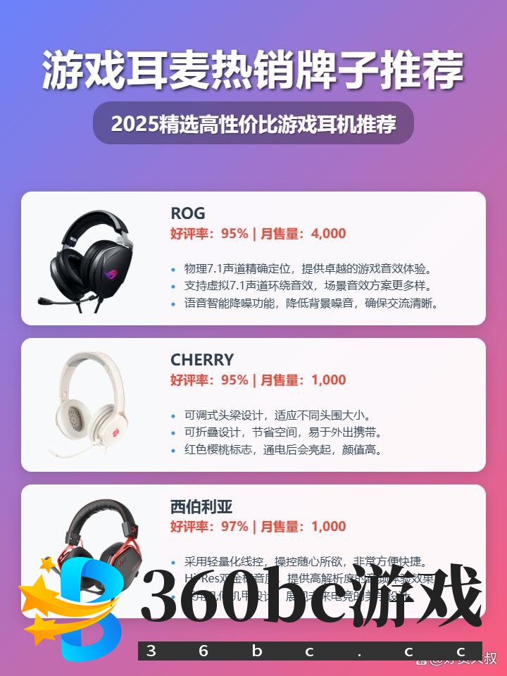 想必各位游戏发烧友都在为选择一款好用的游戏耳麦而苦恼吧?市面上品牌型号那么多,到底哪个更适合自己?别担心,2025年游戏耳麦选购攻略这就来了!这次我们对七款热门品牌进行了深度测评,不仅要看音质、舒适度,还要考虑到麦克风效果、连接方式等各个方面,力求给大家带来最全面、最实用的参考信息。至于这些耳麦质量究竟怎么样,好不好用,值不值得买?文章里都会给出答案。 ![]() 那么,想知道在《绝地求生》里听声辨位更清晰,在《英雄联盟》里语音沟通更流畅,玩游戏时更有沉浸感,体验感更佳吗?想了解ROG、雷蛇、赛睿等品牌的游戏耳麦究竟有何独到之处吗?不用着急,看完这篇2025游戏耳麦选购攻略:七款热门品牌深度测评,相信你心里就有数了。下面,就让我们一起来看看这七款经过精心挑选的品牌型号,希望能帮助你找到最适合自己的游戏耳麦! 热售款:ROG创世7.1 ROG 创世 7.1 这款耳机,音效确实挺赞的!它采用了物理 7.1 环绕声技术,玩游戏的时候,脚步声定位特别准,感觉就像身临其境一样,而且看电影的效果也很震撼,沉浸感十足。 ![]() 不得不说,这款耳机的佩戴舒适度也值得称赞。ROG Hybrid耳罩配合清凉酷冷材质耳垫,戴起来不夹头也不捂耳朵,长时间用着也挺舒服的。D型耳罩设计,即使戴眼镜也不会觉得有压迫感。 ![]() 另外,这款耳机还有一些小惊喜。比如它支持 Aura Sync 灯光同步,可以和其他 ROG 设备一起闪,组全家桶就更帅了!而且,它还自带语音智能降噪功能,语音沟通从此告别嘈杂。 ![]() ROG创世7.1 头戴式游戏耳机 有线耳麦 物理7.1 声道 降噪麦克风 USB接口 黑色 ¥2799 京东月销量1000好评率97%无理由退换京东配送 购买 热售款:CHERRY樱桃(CHERRY)HC2.2 这款CHERRY耳机采用50mm驱动单元,游戏音效很棒,高低音清晰,能让你快速辨别声音方位。而且还支持虚拟7.1声道环绕音效,用起来真的有身临其境的感觉,更容易把握游戏中的机会。 ![]() 这款耳机的佩戴舒适度也很赞,它用的是人体工学柔软PU耳罩和可调节头梁,而且配有柔软硅胶气垫,戴久了也不会觉得难受。加上它还有可折叠设计,收纳起来不占地方,带出门也很方便。 ![]() 这款耳机在设计上也有亮点,比如它的触控式音量调节按钮,可以减少误触,一键就能开关麦克风。加上智能防噪麦克风,保证了通话清晰。麦克风还是可拆卸的,不用的时候可以拿下来,很灵活。 ![]() CHERRY樱桃 HC2.2 游戏耳机带麦电竞耳麦虚拟7.1环绕声道 耳机头戴式 电竞耳机 白色 适配三角洲行动 ¥179 京东月销量200好评率97%无理由退换京东配送 购买 热售款:西伯利亚K03 西伯利亚K03这款游戏耳机,音质方面确实下了功夫!它获得了Hi-Res双金标认证,无论是有线还是无线,都能保证高解析度的音频体验。特别值得一提的是它的CM6646X1芯片,这可是电竞耳机里很重要的一个配置,能让你在游戏中听到的声音更清晰,定位更精准。 ![]() 这款耳机在FPS游戏上的表现确实很棒!它针对射击类游戏进行了优化,可以大幅强化游戏中的枪声和脚步声,让你更好地掌握战场态势。而且,它还能一键开启职业战队同款FPS音效,听声辨位更准,简直就像开了物理外挂一样,必须点赞! ![]() 西伯利亚K03这款耳机在佩戴舒适度上也考虑得很周到,采用Airy D型腔体设计,在声腔内部形成循环回音壁,有效隔绝外部噪音,保证声音不外漏,密封腔音质更加通透饱满。再加上轻量化一体线控,操控起来也是相当方便! ![]() 西伯利亚(XIBERIA)K03有线USB金标7.1游戏耳机电竞耳麦头戴式吃鸡FPS耳机带线控电脑办公麦克风武士黑全网热销 ¥189 京东月销量2000好评率95%无理由退换京东配送 购买 热售款:雷蛇旋风黑鲨V3 这款雷蛇旋风黑鲨V2极速版,不得不说,连接方式是真的丰富,2.4GHz无线、蓝牙无线、USB有线,电脑、主机、手机通吃!而且它还采用了第二代HYPERSPEED无线技术,延迟低至10毫秒,这对于游戏玩家来说,绝对是福音! ![]() 不得不说麦克风这块,雷蛇是下了功夫的!它配备了灵晰技术9.9毫米超宽频可拆卸麦克风,能捕捉更宽的声音频率范围,确保语音沟通清晰自然。再配合上THX空间音效技术,在头部上方增设虚拟扬声器,让声音更有高度感和深度感,玩游戏更有沉浸感。 ![]() 这款耳机在细节上也考虑得很周到。它采用混合面料和人造皮革记忆绵软垫,佩戴舒适,隔音效果也不错。而且,它还配备了丰富的板载耳麦控制,比如麦克风静音按钮、音量旋钮、SmartSwitch智能切换按键等等,操作起来非常方便。另外,第二代雷蛇TRIFORCE 50毫米镀钛驱动单元,细节表现力,脚步声啥的,都更清晰! ![]() ¥60 雷蛇(Razer)旋风黑鲨V3 无线头戴式电竞游戏耳机耳麦 三模 THX音效 可拆麦克风 三角洲EQ调节 CSGO 吃鸡 白色 ¥1198.99 京东月销量600好评率96%无理由退换京东配送 购买 热售款:外星人AW920H 外星人AW920H这款耳机,音质确实没的说!它搭载了经过Hi-Res认证的40毫米驱动单元,能把游戏里的细微声音都清晰呈现,听声辨位更准了,不管是脚步声还是环境音,都能捕捉到。听音乐时,也能感受到更丰富的层次和细节,高解析音频带来的体验就是不一样! ![]() 这款耳机还配备了AI降噪麦克风,这在嘈杂的环境里开黑简直太实用了!它能智能过滤掉环境噪音,队友听到的声音更清晰,沟通效率更高。而且,它还支持多种连接方式,蓝牙、2.4GHz无线和有线,想怎么连就怎么连,很方便。 ![]() 不得不说,外星人AW920H在舒适性方面也下了功夫。它