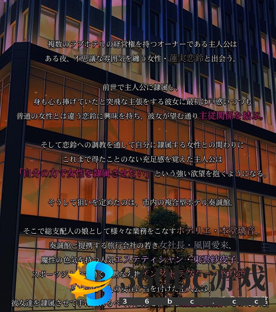 【写在前面:这个专栏因部分粉丝呼吁而尝试设立,不提供任何游戏下载途径,,Ծ‸Ծ,,】 十一假期旅旅游回家,是时候恢复更新了 9月26日的天王山之战作品也快更完了,还差一部古神复活的= = ![]() 今天的主角是隷従の制服 本作发售于2025年9月26日,开发社团是BISHOP,国内一般称之为主教社 主教社在国内的热度非常高,这一点是凭借其题材和里番化的成功而达成的 旗下作品80%都是主打一手过激调校系,其中比较著名的有馆系列,学园系列,屈辱系列和家属系列等等 ![]() 本作的基本情况如下: ![]() 从staff中能见到一些很熟悉的名字 但也有一些人存在一定的争议,比如画师T28,CV叶一华等,很多玩家对她们的表现极不满意 售价方面,本作在fanzagames上售价为8800日元 ![]() 在销量上位列本月第七位,低于同日发售的甜蜜女友、柠檬水果酱以及学园3 ![]() 玩家扮演经营着多家情侣酒店的老板【三原隆也】,某一天下班回家时突然遇到一位妙龄少女【莲实恋铃】自称是他【前世的奴隶】,要求隆也今生也要当她的主人。感到莫名其妙的隆也虽然不信她的【前世】说辞,但天上掉馅饼的事情哪能不干。拿下少女后,隆也竟然真的觉得自己的身体里燃起了一股极其强大的欲望——渴望征服,让她人全身心的臣服在自己脚下。为此,他盯上了几位容貌家世都不俗的猎物...... ![]() 本作的剧情,还算是主教社一贯的风格 剧情有逻辑,但也仅仅就是有逻辑了,至于这个逻辑是不是合理的,那就不在本作的考虑范围内了 推倒女主角也是经典的抓把柄+胁迫+“不停地攻击”到女主角食髓知味然后欲求不满,这个时候再来一手欲情故纵让女主角“认识到自己的本性”,最后一击让其“觉醒”甘愿认主的桥段 万事开头难,最难处理的开头钓鱼阶段当然是选择已经用烂了的手段——夫人,你也不想其他人知道吧 ![]() 在攻略过程中也会夹杂着一些搞笑的情节,这一点还不错,节选一点: 什么永恒支配者??! ![]() 有人能告诉我上厕所出现彩虹这个事情是真的能发生吗? ![]() 还就那个别把我当人 ![]() 除了这些,整体的叙述风格还算看得过去 最值得一提的是,虽然整体主打一个过激支配,但本作和同类型的圣奴隶学园3的公车私车不同 在支配完成后,本作的基调是“纯爱支配”(我自己造出来的词),男主和女主之间虽然是所谓的“隶属”关系,但男主绝对是百分百的爱着她们的,这一点从各个剧情环节都能看出来,比如帮助女主经营事业,帮欠债的女主还完巨额贷款,怀孕了就和她们结婚等等,也绝不允许别人染指 ![]() 本作采用slg形式的系统推进剧情↓ ![]() 根据玩家的选择共有5条个人线和1条后宫线,所有的结局都是以女主角怀孕后过上没羞没臊的幸福生活为基准的 本作共5名可推倒的女主角,我直接全部贴在这里: 各种信息和三围官网都公布了,也省了我很多功夫-=- ![]() ![]() ![]() ![]() ![]() 本作的人物设定还算齐全 各种守备区也基本上都覆盖上了 理所当然,本作最受欢迎的角色是黑毛和紫毛,而“体育生”红毛又是最不受欢迎的 虽然这和本作红毛CV有一定关系,但是也再一次作证了同类作品中这类角色确实受众较少的事实 实事求是地讲,本作的人物绘画真心一般,CG中也屡屡出现作画崩坏人体不成比例等等问题 但是本作主打的“反差感”弥补了这一点,能玩的下去的玩家绝大部分都是因为人物刻画中的“堕落前”对你百般瞧不起和“堕落后”逆来顺受这些情节所营造出的极大的反差感 ![]() ![]() 遵循着主教社历来的传统,本作拥有这几项区别于其他社团作品的特殊功能 第一点就是你们在对话栏目右下角能看到的视图切换 在女主角有立绘的时候,你可以自由选择3种视角以便观看自己喜欢的细节 ![]() 第二点是所谓的【脱衣设定】 其实就是自定义角色立绘,玩家可以自定义角色立绘的形象 从全着衣到不着衣一共有5种形式,玩家还可以手动给女角色加上嗨丝,确实很不错 如果特别喜欢某一个角色,玩家甚至还可以单独为她配置立绘条目 ![]() 第三点是优秀的回想系统 主教社历来作品的优良传统,我想这一点确实值得所有的厂商学习 回想分为正常事件和恩爱事件两部分,每个回想都明确标注事件大纲 就算是全回想玩家,也可以透过这些看到大概的来龙去脉 ![]() 除此之外,看恩爱事件的时候,系统也会给予玩家选择 是观看有关这一事件的前因后果还是直接开冲,非常贴心 ![]() ![]() 为什么分辨率和画风画质都不被人看好的本作销量却很高?这完全是因为这一环节 数量上,本作包含了69个全体量恩爱回想,单个回想包含2-5个具体情节,按照其他游戏的标准,本作的有效回想数量其实应该在200个左右,确实是量大管饱 当然也存在一些CG复用,前面的CG改一改拿到后面去用的问题,不过至少具体情节和表述有所区别 质量上则显得稍逊一筹,基本上是主教社传统的作画风格,看肯定是能看,但要和海豹社那些去比完全就是被吊打了,人物身体比例和人脸也存在着不同程度的崩坏情况(不过我看到有玩家认为这种情节下把女主角的脸画崩反倒是别有韵味) 玩法上,我体验下来基本上给三个关键词:两扇门、道具、多重cosplay。本作的剧作家一看就是那种喜欢不走正面的伙计,在本作几乎60%的回想都有走偏门的情节;道具就不多说了,对于本作的题材来讲这也算正常,各种奇怪的道具都有出现,差不多也占了60%左右的回想;所谓的多重cos指的是